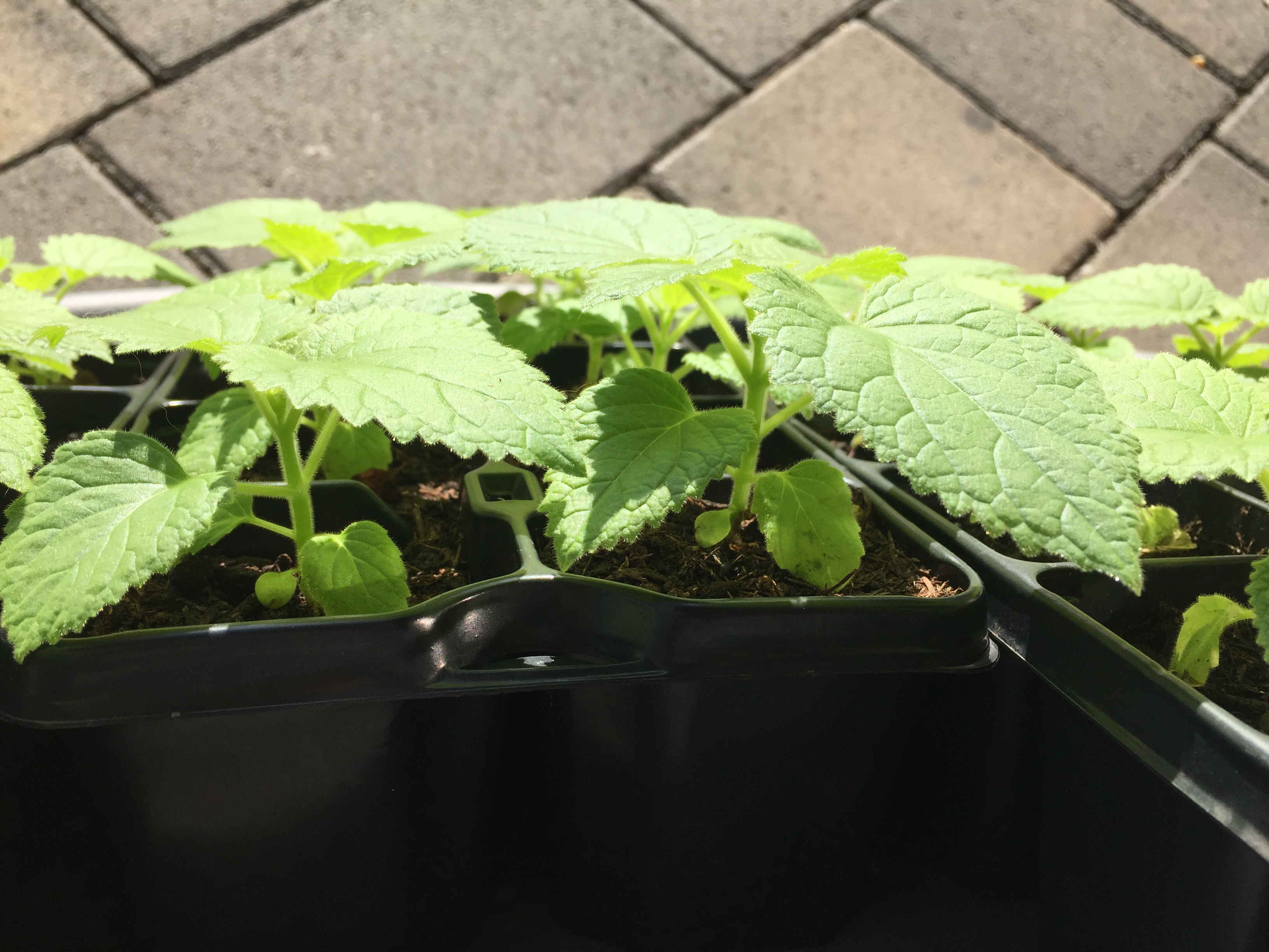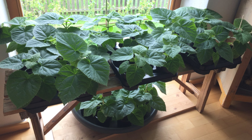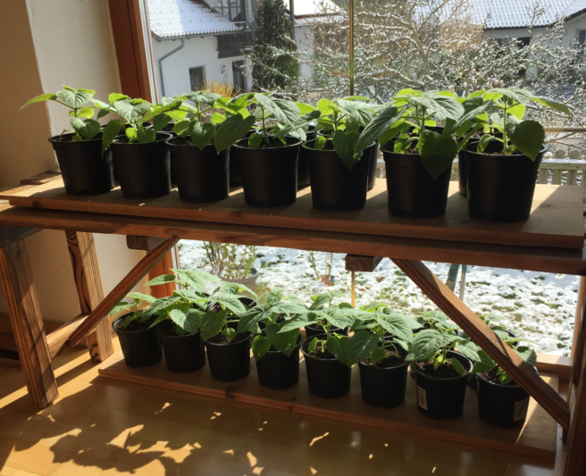 Jetzt wird es Zeit, dass die Eisheiligen (Mitte Mai) vorüber sind und die kräftigen Bäumchen ausgepflanzt werden können. Die Pflanzen beginnen schon, sich gegenseitig zu überwuchern.