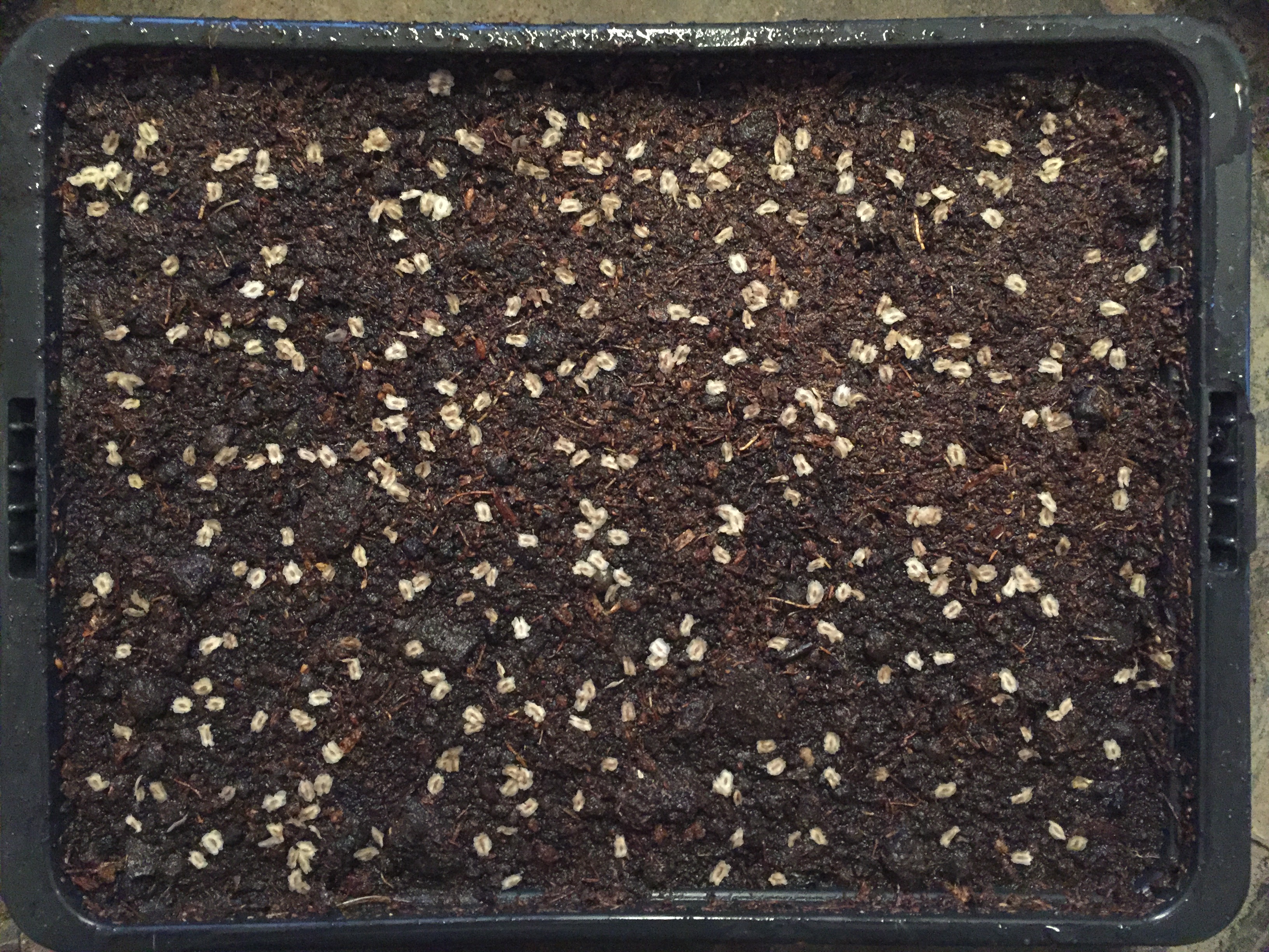 Das erste Blattpaar nach den Keimblättern hat sich gebildet. Für mehr Platz zum Wachsen werden die Sämlinge mit gleichmäßigen Abständen in eine Saatschale mit frischer Anzuchterde pikiert.